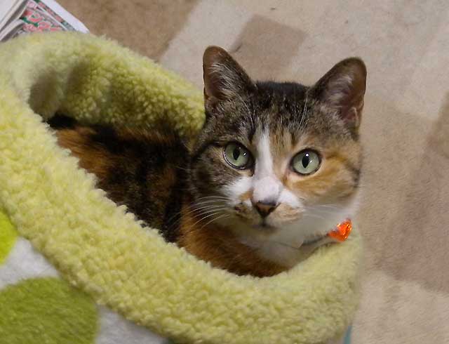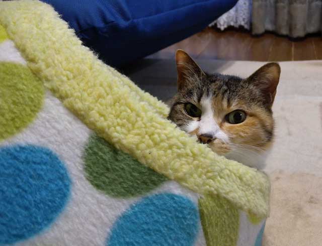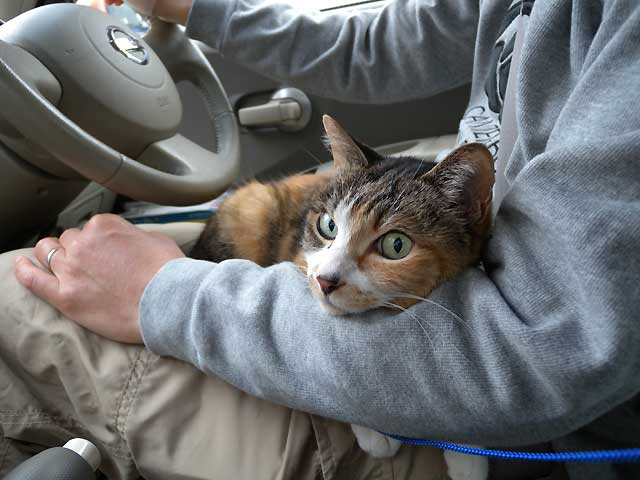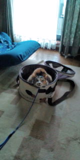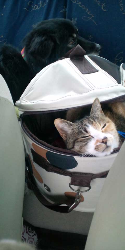自分から三毛キャリーに入って準備万端。