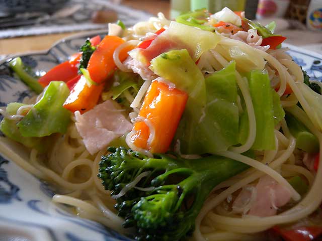 帰宅してのランチは産直でげっとした野菜のスパゲッティ。